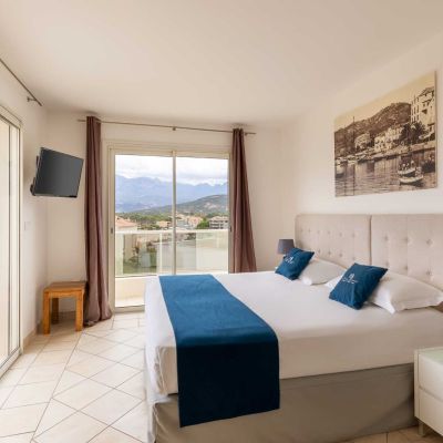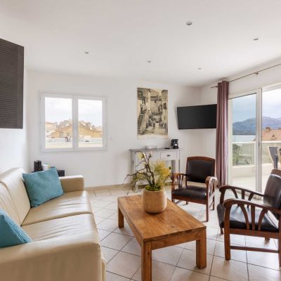 La suite est décorée avec goût, le design est épuré & moderne. C’est un logement à l’atmosphère calme et reposante avec la vue mer sur la baie de Calvi.